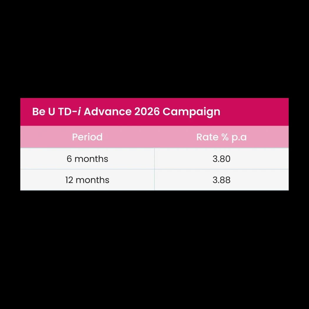 Join Be U TD-i Advance 2026 campaign with returns up to 3.88% p.a. for a 12-month tenure. The campaign runs from 13 February 2026 to 31 March 2026.