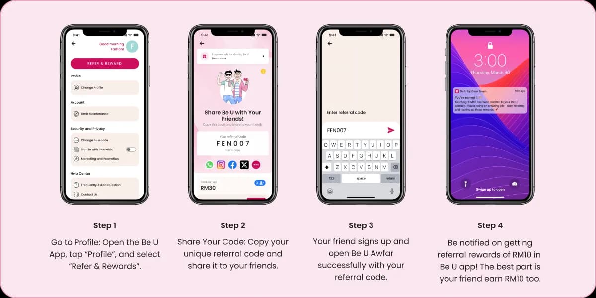 Double the joy when you share Be U Awfar to friends with your referral code. RM10 each for both of you when they successfully open Be U Awfar! Refer now from 14 February 2026 till 31 December 2026.