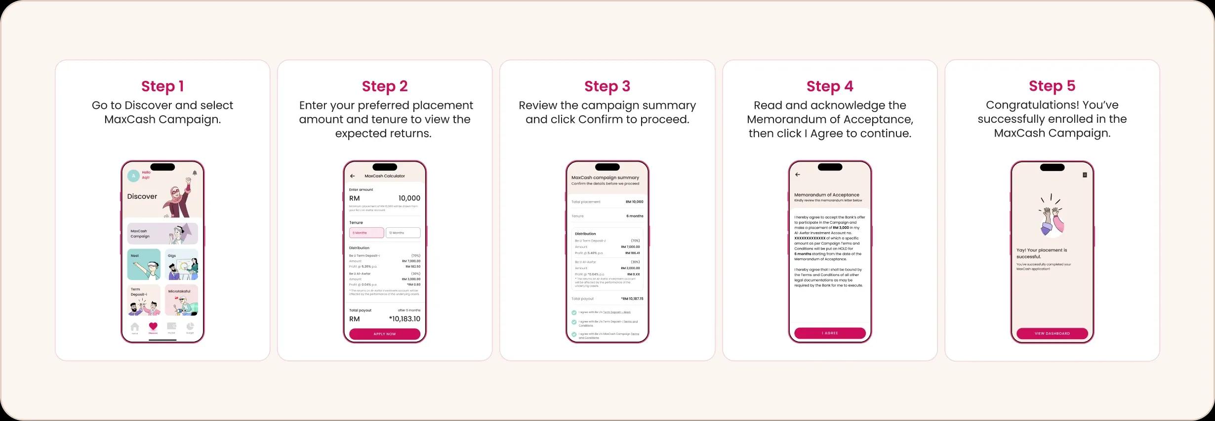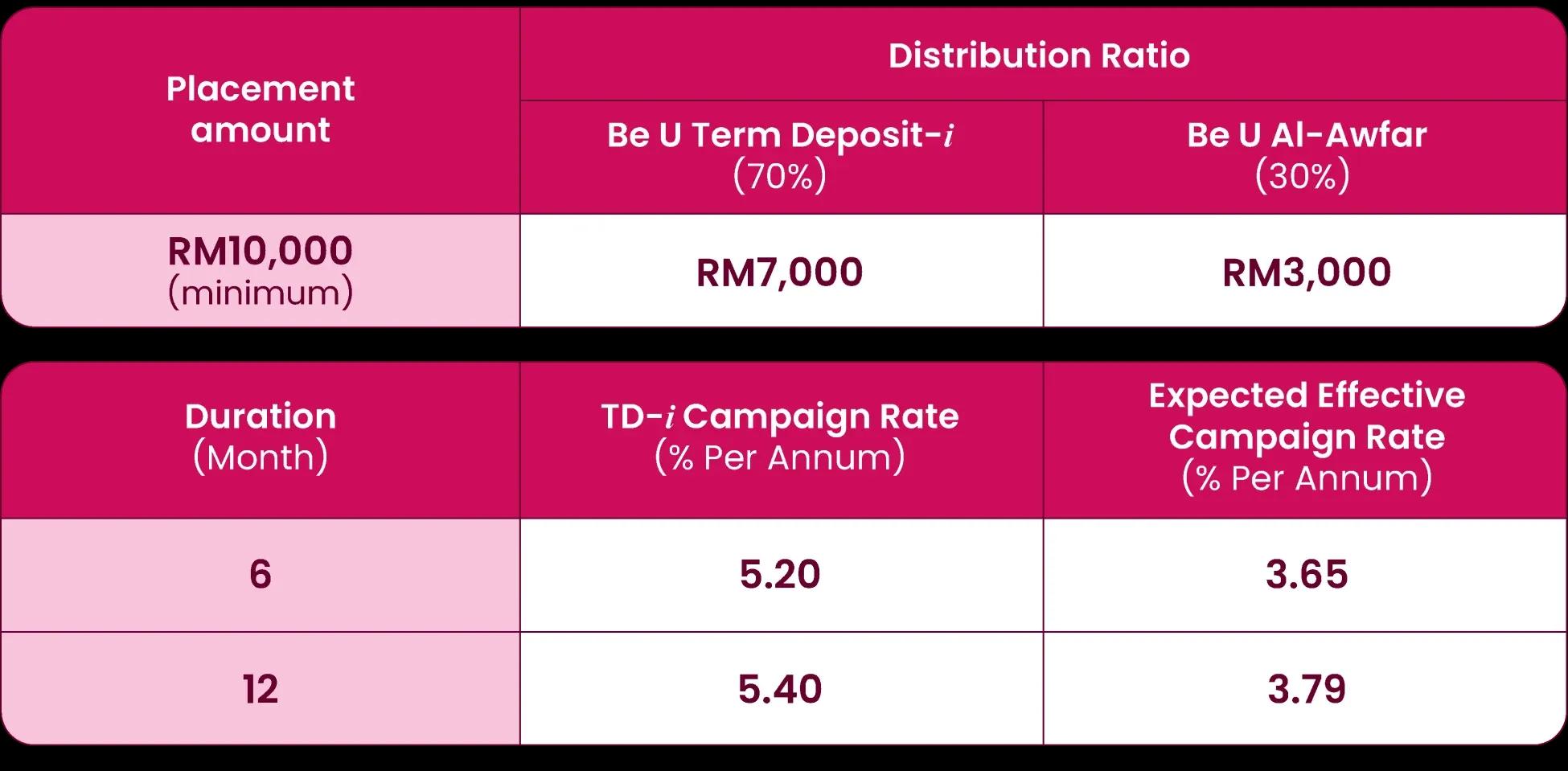 The Be U MaxCash Campaign is a limited-time offer that combines Be U Term Deposit-i (70%) and Be U Al-Awfar (30%). It gives you fixed returns from Be U Term Deposit-i and eligibility for Be U Al-Awfar’s monthly prize draws.