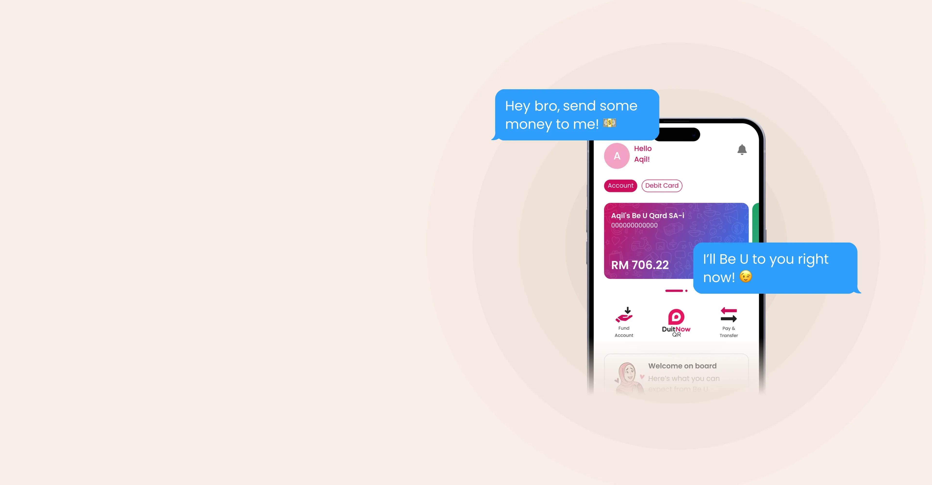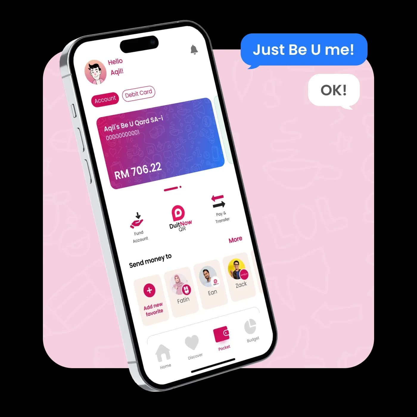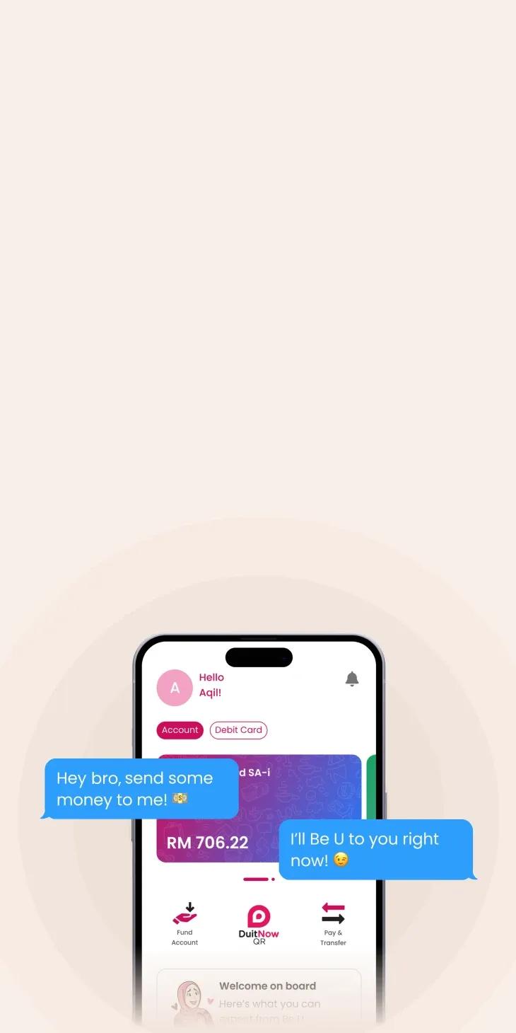 Pay and receive funds from any participating bank or eWallet with your Be U account number or QR code. DuitNow Transfer and DuitNow QR make things simpler.