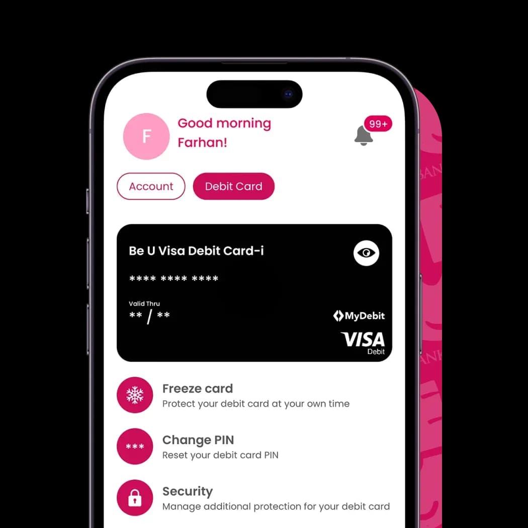 Experience the convenience of Be U Visa Debit Card-i. Accepted worldwide, it’s more than just a card – it’s your key to hassle-free spending.